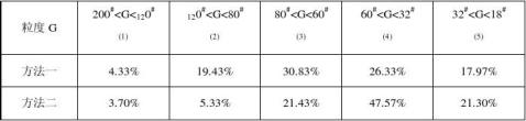 對顆粒粒度分布情況的數(shù)據(jù)和圖表進行分析比較,可以看出方法二顆粒粗細比較均勻,基本上接近于正態(tài)分布,較為理想,60#<G<32#的顆粒 由方法一的26.33%提高到47.57%,而120<G<80的顆粒由