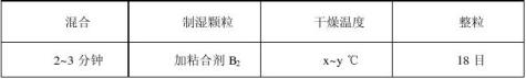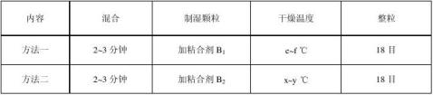 方法一:內(nèi)加輔料A,粘合劑B1 ,外加1%的輔料C 高速攪拌制粒,沸騰器干燥。 方法二:內(nèi)加輔料A,粘合劑B2 ,外加2%的輔料C 高速攪拌制粒,沸騰器干燥。 1. 處方組成,1000片用量見表1