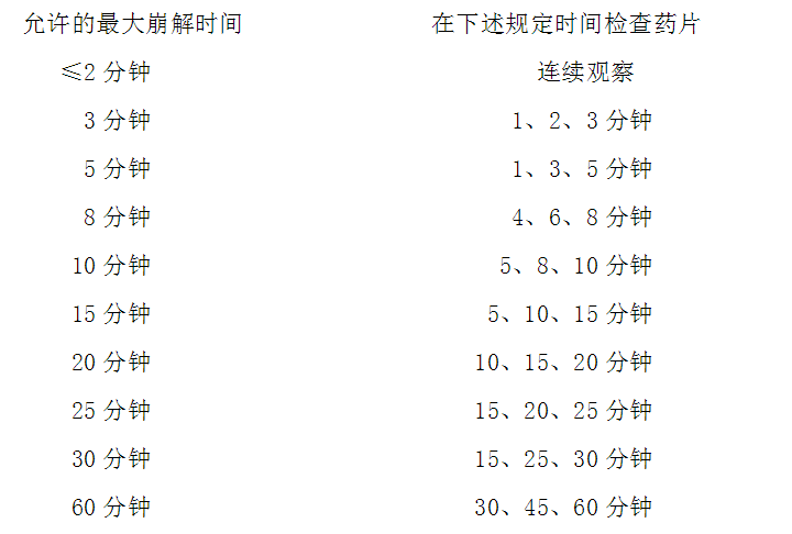 4.2測定:使用IPC記錄所指定的崩解介質,從樣品取6片,分別放入崩解儀的6個管子中,按下列時間表檢查崩解情況。