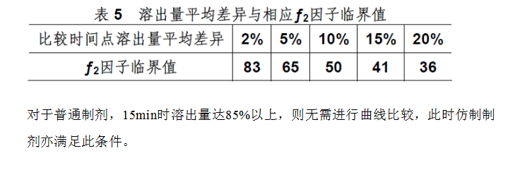 兩條比較曲線上任一比較時(shí)間點(diǎn)溶出量平均差異限度不大于10%的考慮。表5提供了溶出量平均差異與相應(yīng)ƒ2