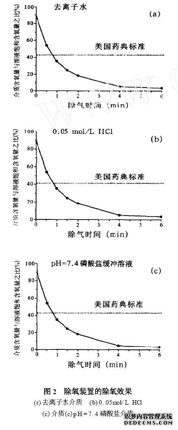 磷酸鹽緩沖溶液(pH = 7. 4) 。將三種介質(zhì)分別放入溶解裝置, 然后通入氦氣, 在37 ℃、攪拌漿轉(zhuǎn)速100rpm 條件下,通氣6min。除氧裝置的除氧效果如圖2 所示。這種方法適用于各類介質(zhì),氦氣使用量很低,只要1min 就可達到美G藥典的要求,有望得到廣泛應用。